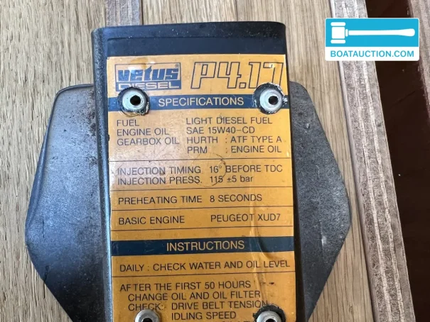 The boat is equipped with a Vetus 4.17 inboard diesel engine with a power of 56 hp. The engine has four cylinders and approximately 1300 running hours. The engine mounts were replaced a few years ago. The fuel tank has a capacity of 200 liters, providing a wide range. The cruising speed is around 8 km/h, with a maximum speed of 15 km/h. The electrical installation consists of three batteries, a battery charger, alternator, inverter, voltmeter, and shore power connection. The onboard voltage is 12v.