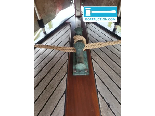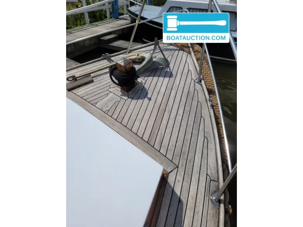 On deck, the sloop is equipped with a teak deck, which contributes to the classic appearance and provides grip in wet weather. Furthermore, the boat is equipped with a sprayhood, cockpit tent, cockpit table, and tarpaulins. Fenders and lines are present, as well as two anchors attached with lines.Â