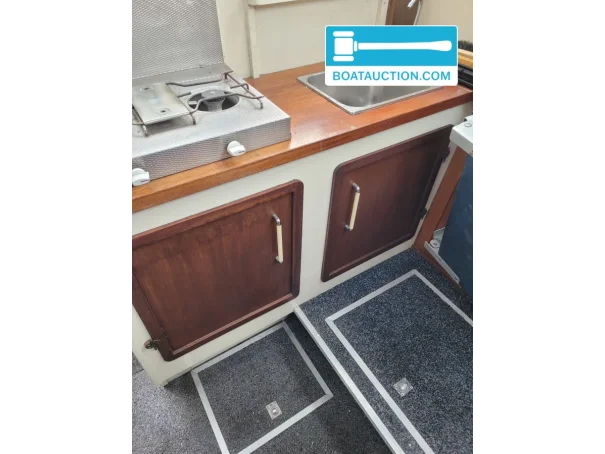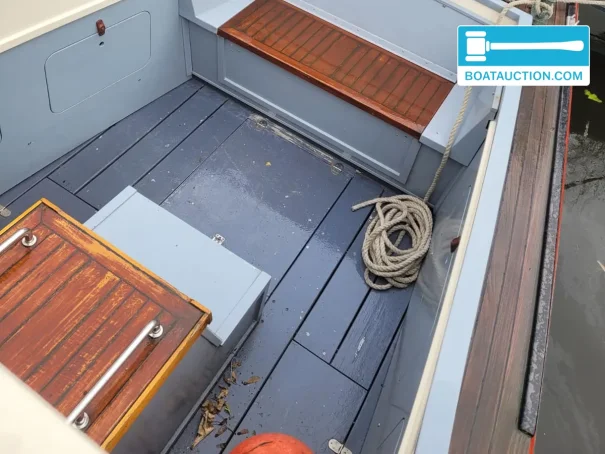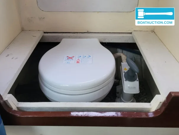 Inside, the sloop offers a headroom of 2.10 meters, which is exceptional for a ship of this size. The accommodation is equipped with a double bed, a manual toilet, and a stove. Additionally, there is a refrigerator and a water tank with a capacity of 150 liters. Mattresses are present, making the ship suitable for overnight stays and weekend getaways. The toilet discharge goes directly into open water, which is common for ships of this age and construction.