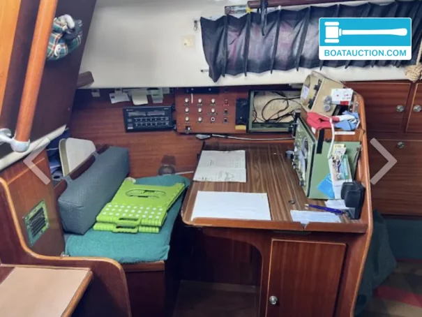 For navigation, the boat is equipped with an autopilot, depth meter, compass, log/speedometer, and a VHF radio. The Contest 33 has one aluminum mast and a manual furling and reefing system. There are four sails: a jib, genoa, mainsail, spinnaker, and storm jib. The condition of the sails is described as reasonable.