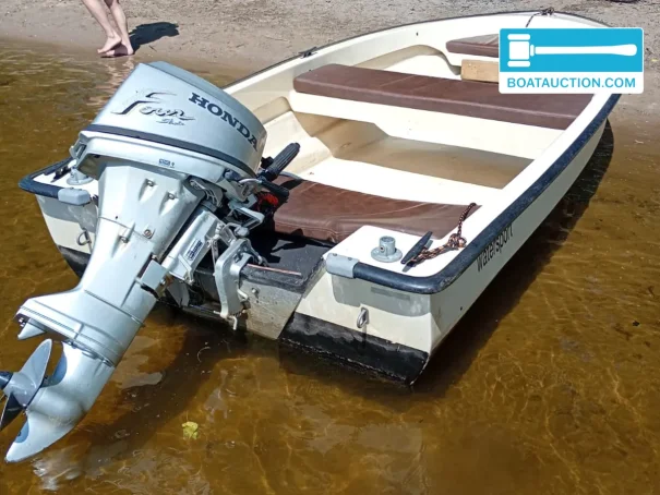 The Verano 410 is equipped with a Honda outboard motor of 8 HP. This four-stroke engine is hand-started and has four cylinders. The engine is from the year 2000 and runs on gasoline. The fuel tank has a capacity of 12 liters. The specified maximum speed is 18 kilometers per hour, which is sufficient for recreational use on inland waters.
