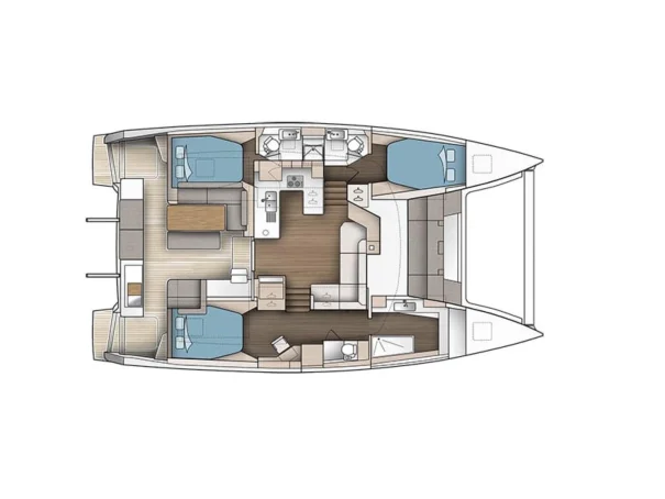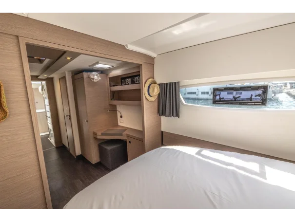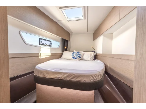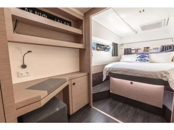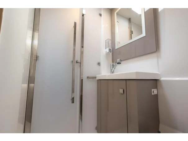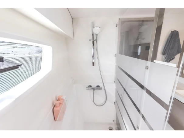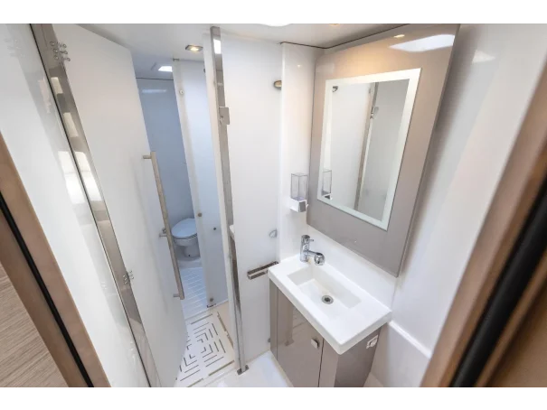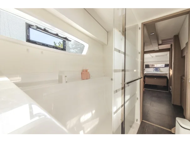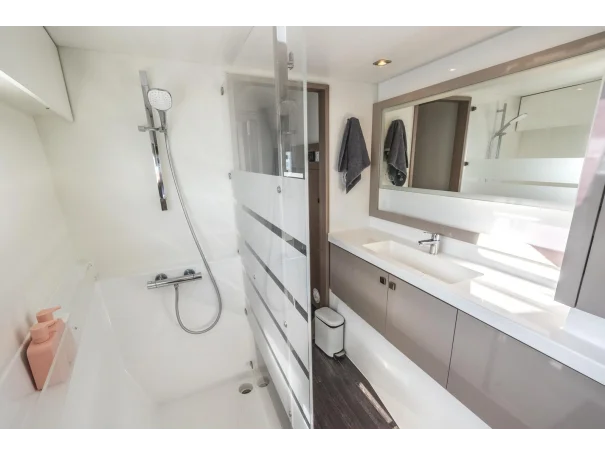 One hull is dedicated to the owner's suite, with generous headroom, walk-in shower, and full privacy. The guest hull has two queen cabins, each with its own head and a shared central shower room – ideal for visitors or family. The saloon is spacious with wrap-around windows, while the cockpit and helm area provide great visibility and lounging space.