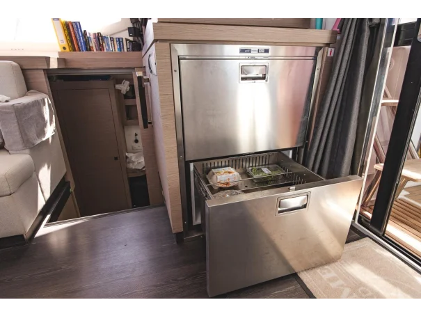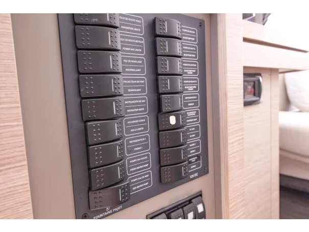 Her upgrades and small touches make life aboard easy: from 100 m of chain and mooring reels to extensive sunshades, cockpit cushions, spice racks, and curved furniture details. Everything has been chosen with care.