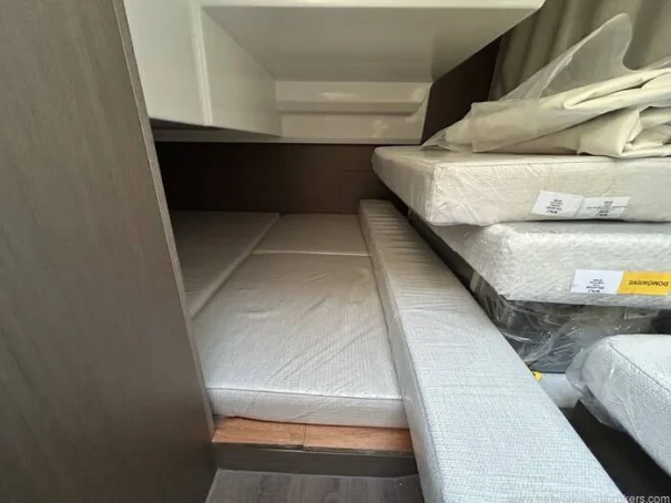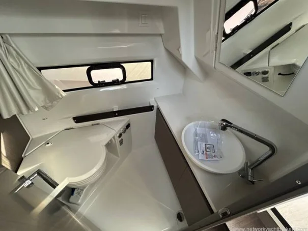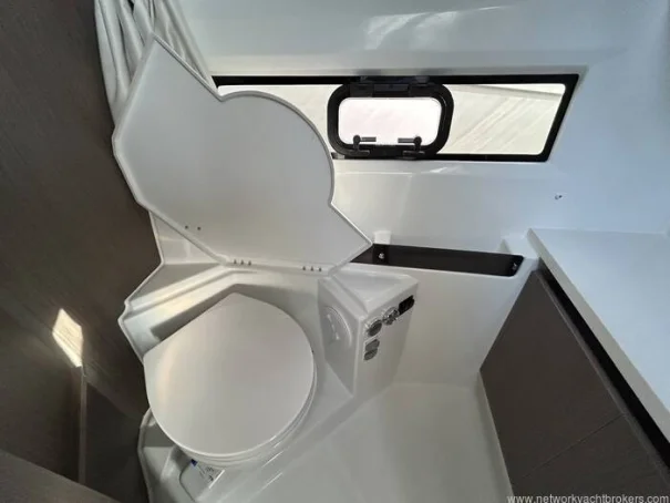 There is a large 2m long island berth double in the master, forward cabin that also has a large storage under the berth. This cabin also has the upgraded storage lockers overhead. This cabin has a large amount of light coming in from the long sea vision inspired potholes and the deck hatch which allows for ventilation. This cabin also has the option extra overhead storage lockers fitted and has a hanging wardrobe on the Portside. This cabin also has ambient, indirect LED lighting as part of the Premier pack.