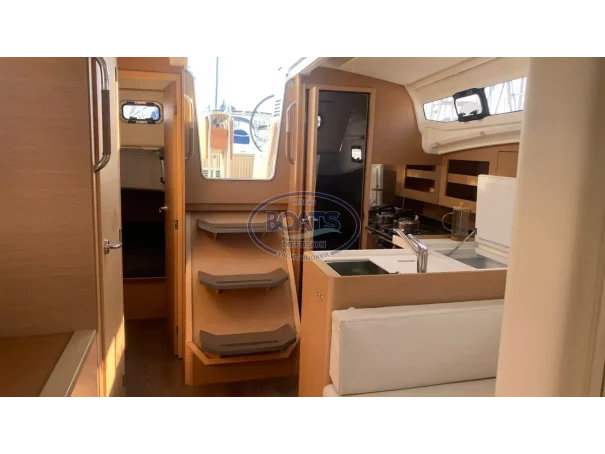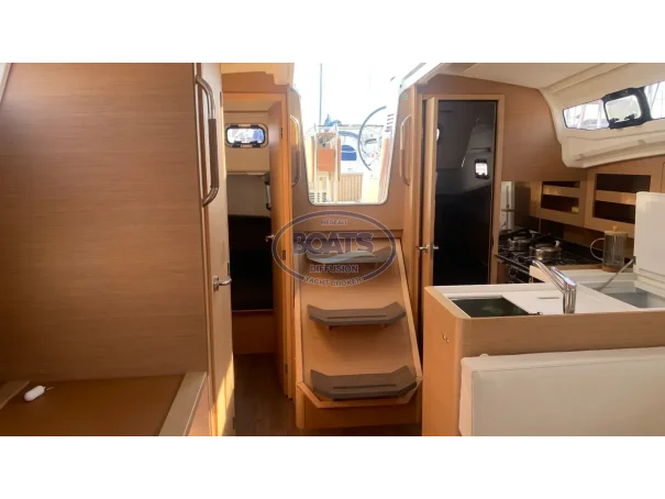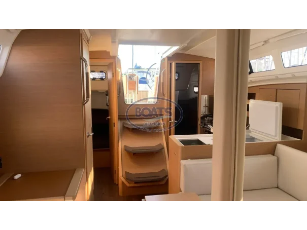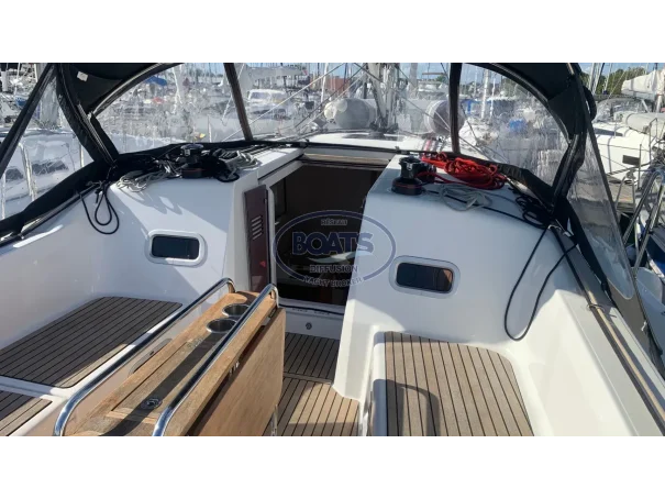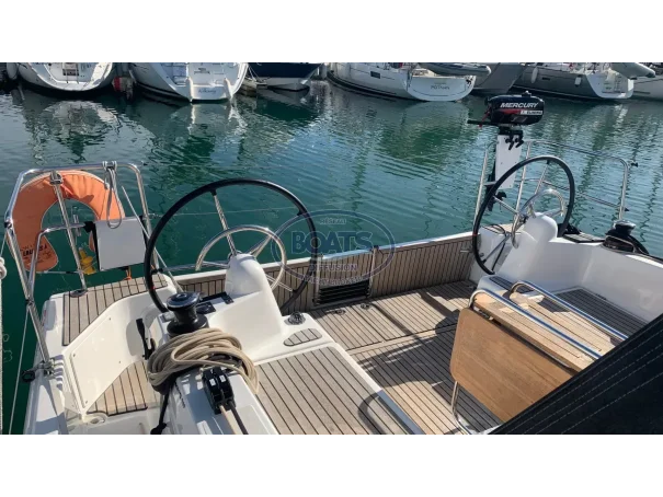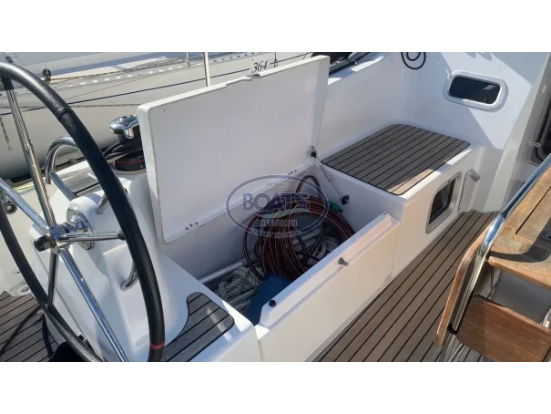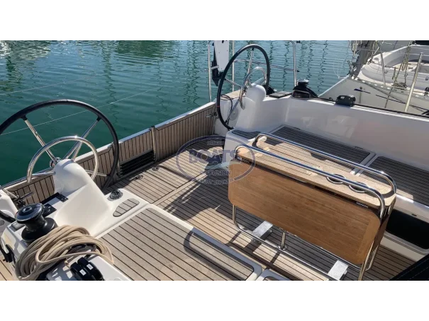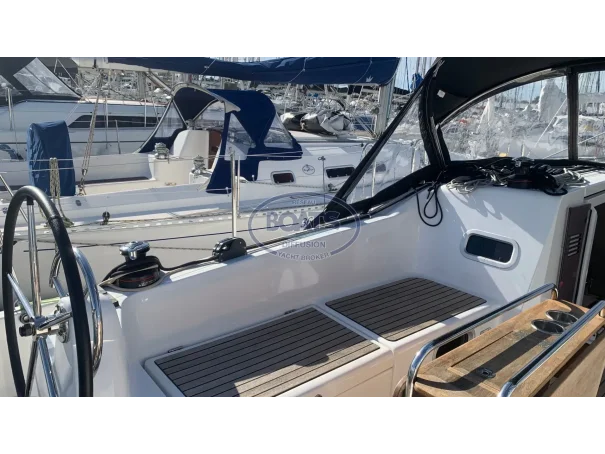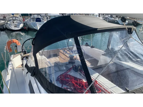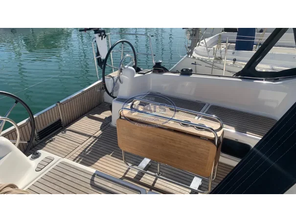 Deck/rigging: Semi-battened mainsail 2 reefs, Genoa on roller 110%, asymmetrical spinnaker, graphite lazy bag, high transparency bimini with LED, wooden cockpit table with drop leaves, covers (wheel, table), 2 halyard bags, teak cockpit, folding swim platform + telescopic ladder