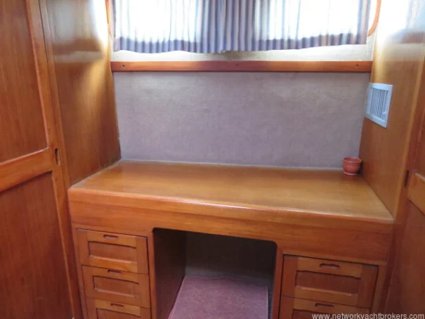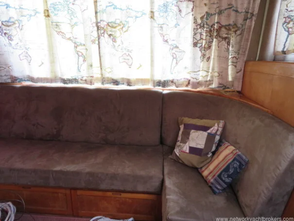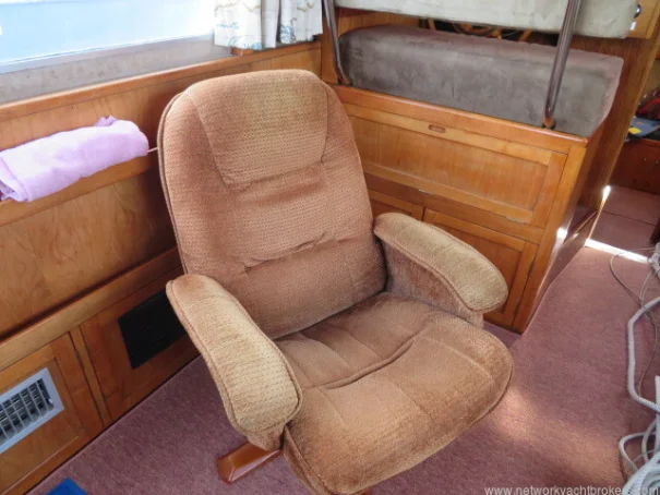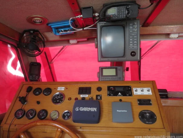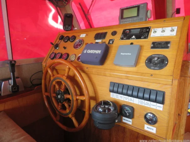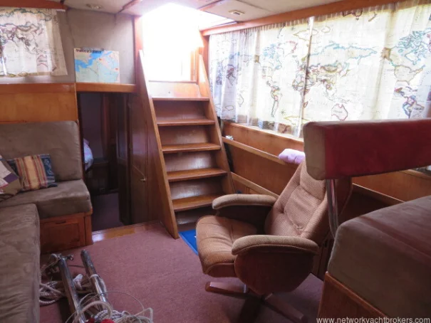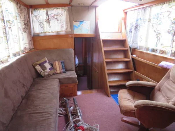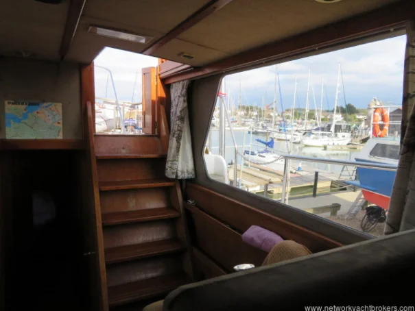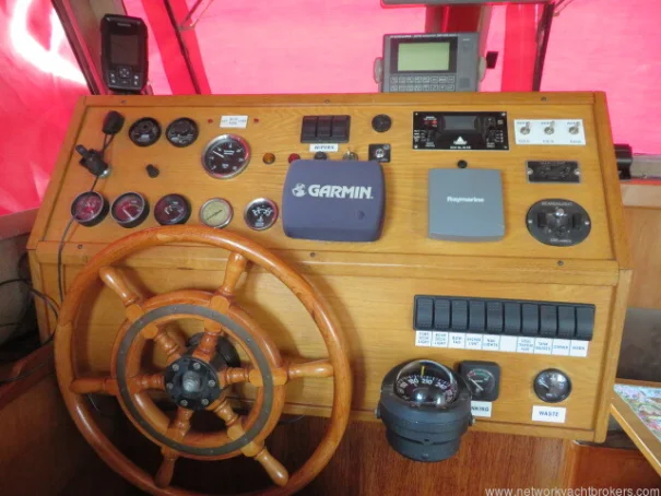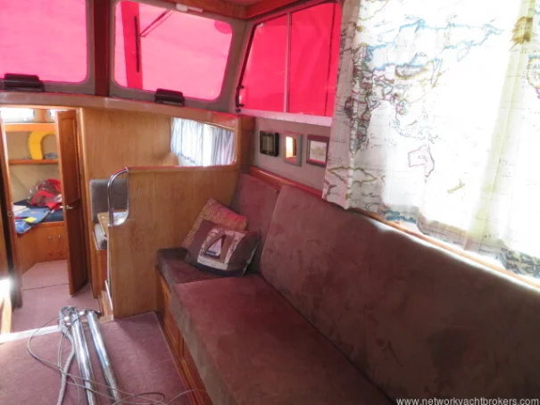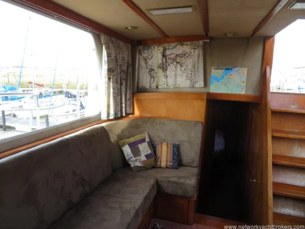 The helm stations, due to their upper and lower positions, give excellent visibility and easy access to the side decks and aft cockpit. This trawler motor yacht has Eberspacher diesel cabin heating, D4. The upholstery is chocolate coloured velour fabric, which gives a warm, cozy feel to the vessel.