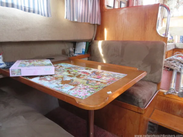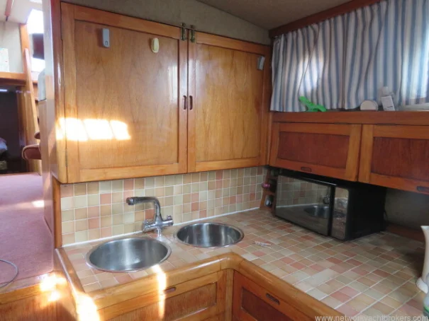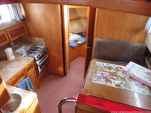 The raised saloon and wheelhouse form a welcoming social area, featuring panoramic views through large windows. You step down into a comfortable dinette with a table that seats four, with the galley opposite. The galley offers all the essentials for onboard living, including a 2-burner gas cooker, an oven with grill that was new in 2024, a double sink with hot and cold water, a refrigerator and freezer, and abundant storage for provisions