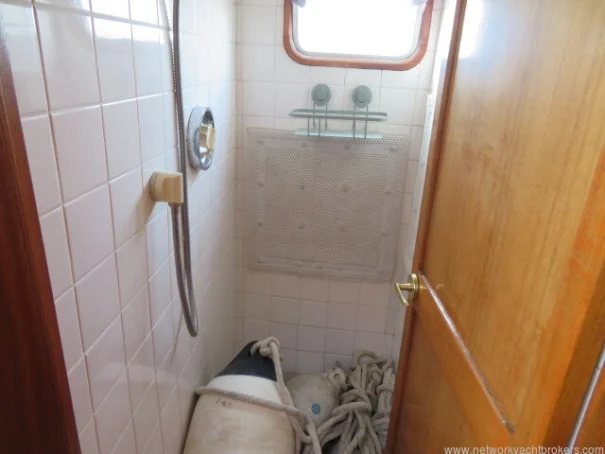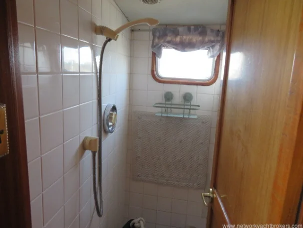 Aft down a couple of steps lies the owner’s cabin, featuring a spacious offset double berth, wardrobes, and additional storage, offering privacy and comfort for longer stays aboard. It also has a separate shower with pressurised hot and cold water and a marine head with sink with hot and cold water, a marine toilet with a holding tank.