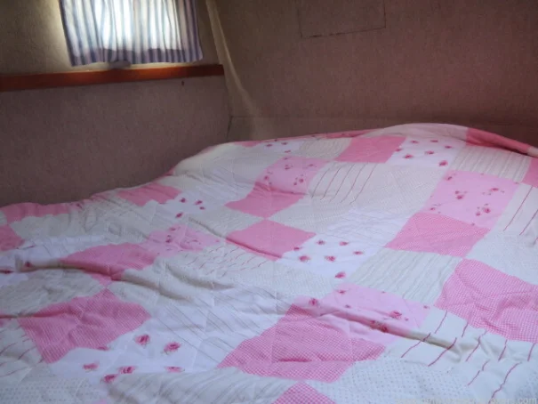 Forward is a bright double cabin with a generous V-berth, plenty of storage, and natural light from an overhead hatch. It has good storage space.
