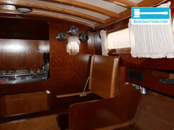 The boat is equipped with a Volvo Penta MD 11 C inboard diesel engine with a power of 23 hp. The engine is electrically started and features various gauges, including a fuel tank gauge, oil pressure gauge, temperature gauge, and tachometer. This equipment provides the skipper with sufficient information to monitor engine performance while sailing.