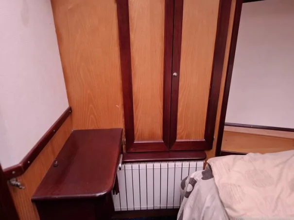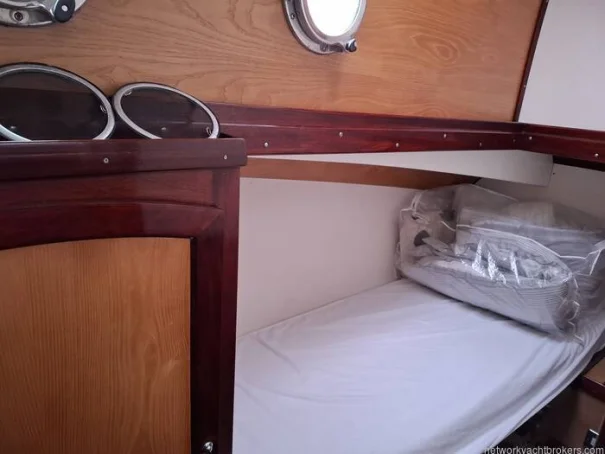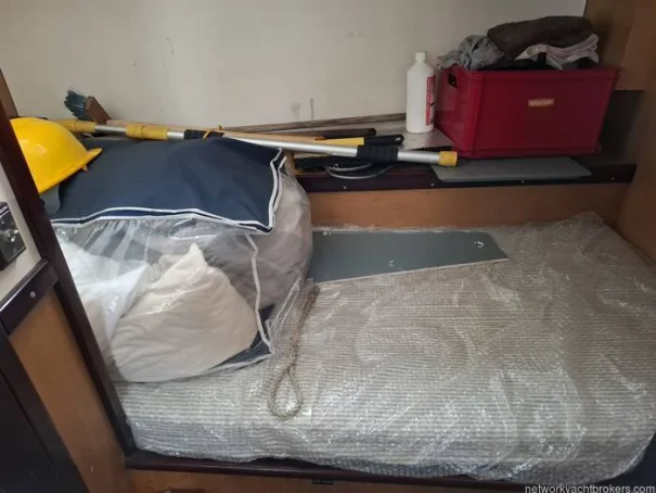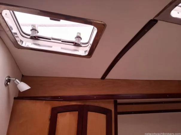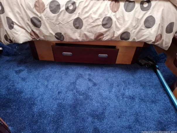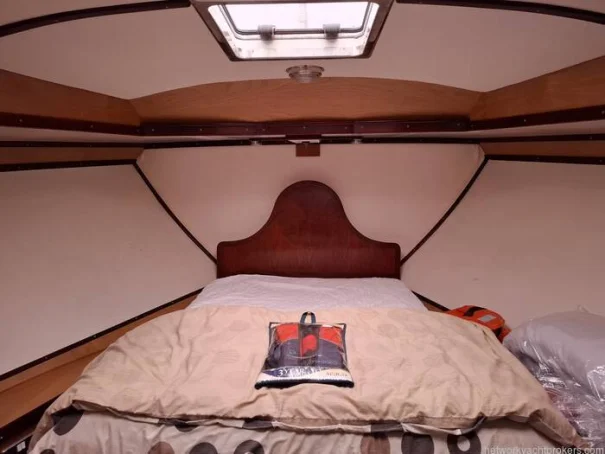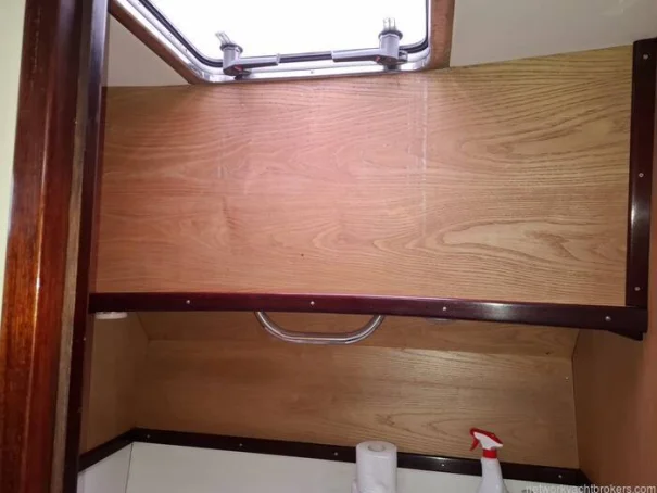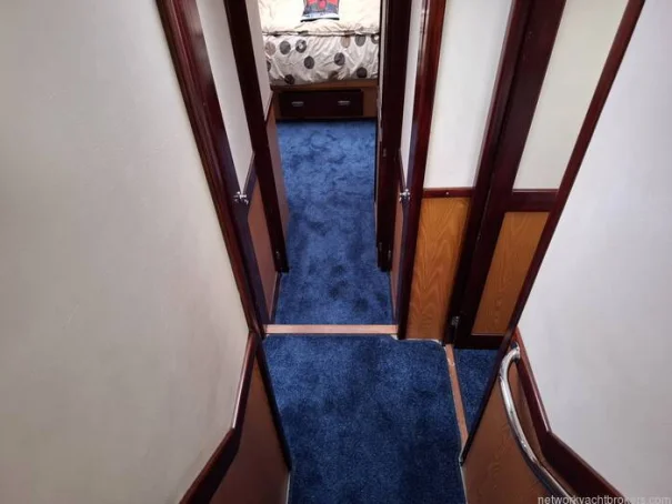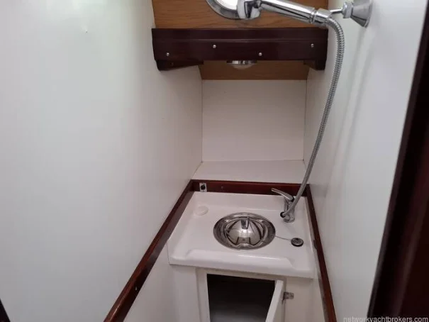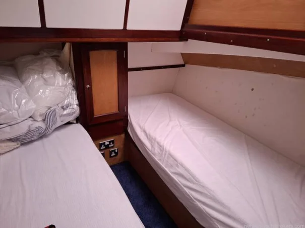 Steps to aft cabin with two berths & aft toilet with hand pump and wash basin.