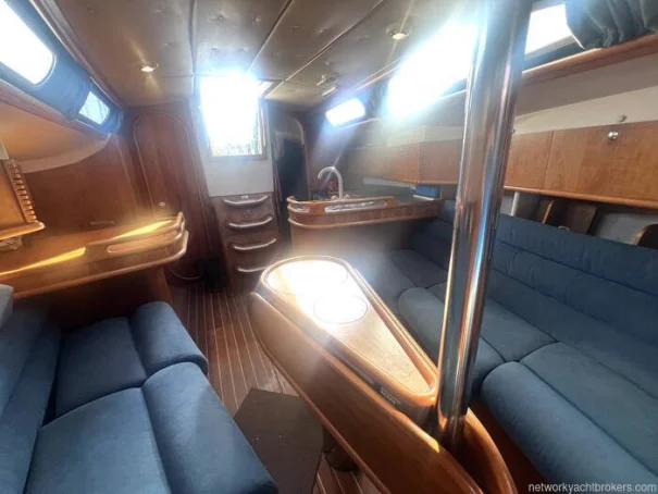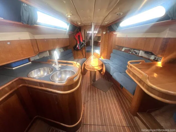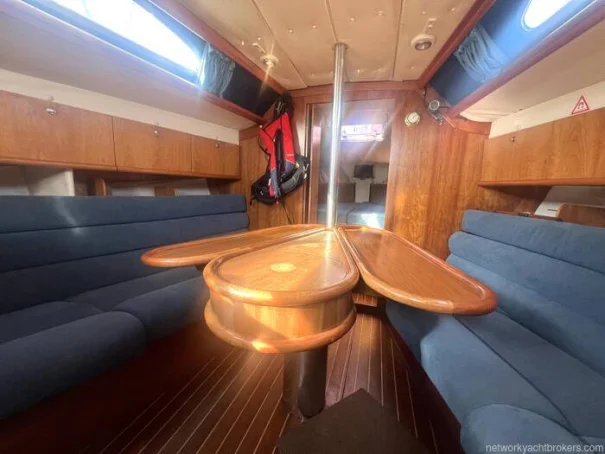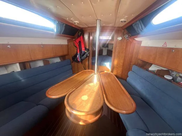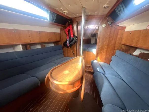 Port and starboard single settee berths with shelves outboard. Overhead door fronted lockers running the full length of the saloon. Central double leaf table. Coachroof windows. Opening deck hatch.