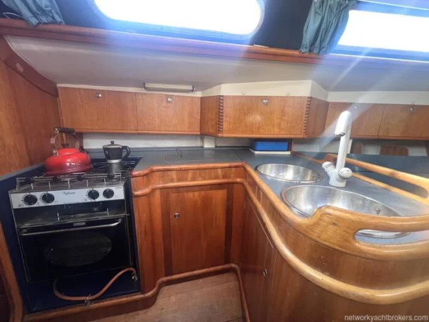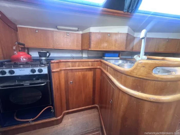 L shaped galley to port aft. Flavel Vanessa 2 burner gas cooker with oven and grill. Top loading refrigerated cold storage. 2 x round stainless steel sinks with pressurised hot and cold water via a mixer tap.