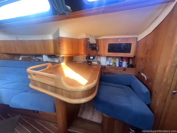 Opposite the galley to starboard. Large forward facing chart table with internal storage for charts. Ships electrical distribution panel and instrumentation.