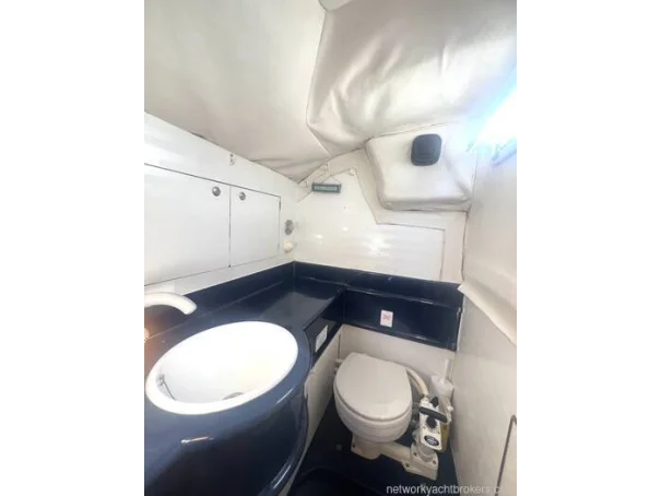 Aft to starboard. Jabsco manual marine toilet. Wash basin with hot and cold pressurised water. Shower. Opening portlight.