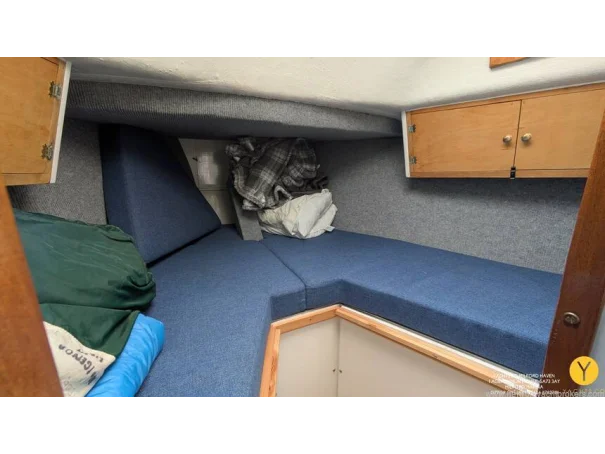 Sleeping 5 in 2 cabins. Light blue upholstery throughout in good condition.