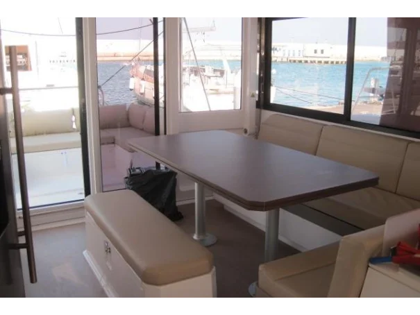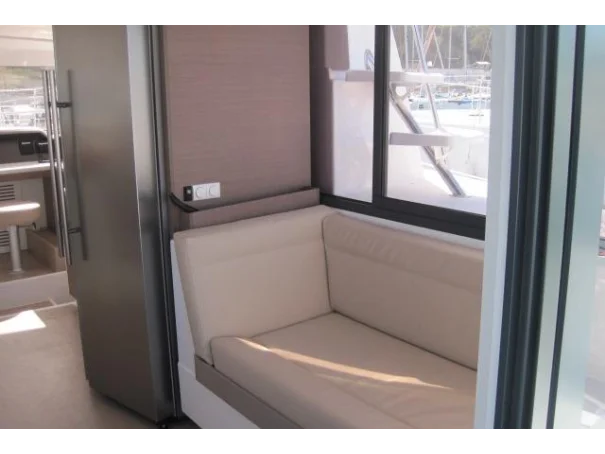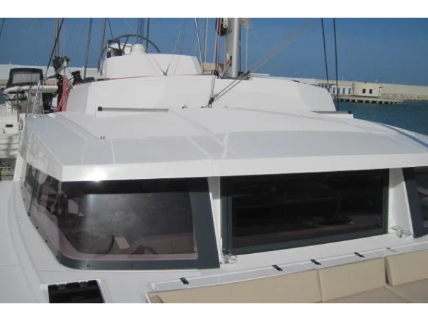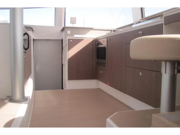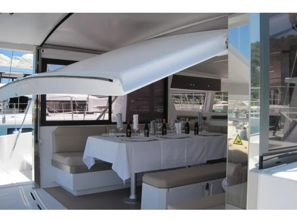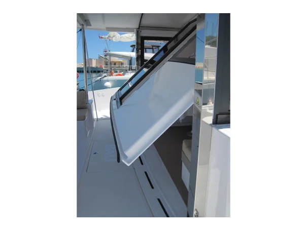 This is the Bali 4.3's strongest selling point. The seamless integration of the salon and cockpit, achieved via the innovative tilting garage door-style transom, creates a massive, singular living area. This feature maximizes volume, light, and ventilation.