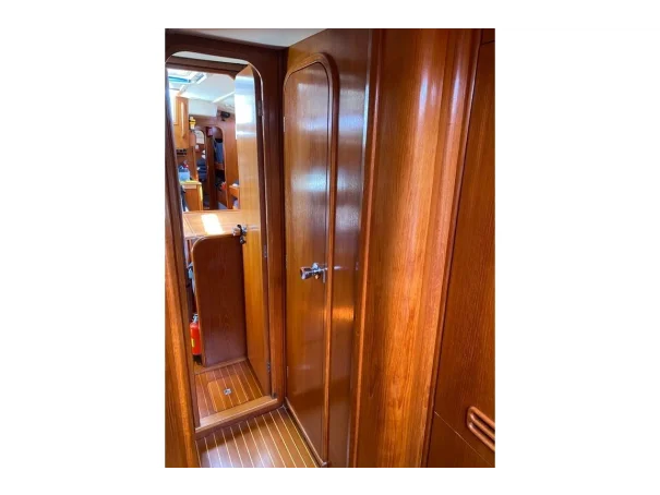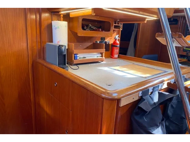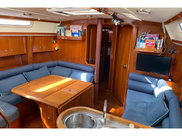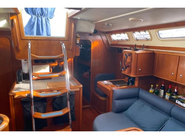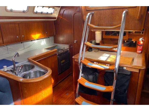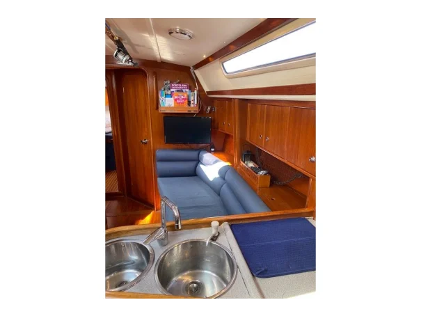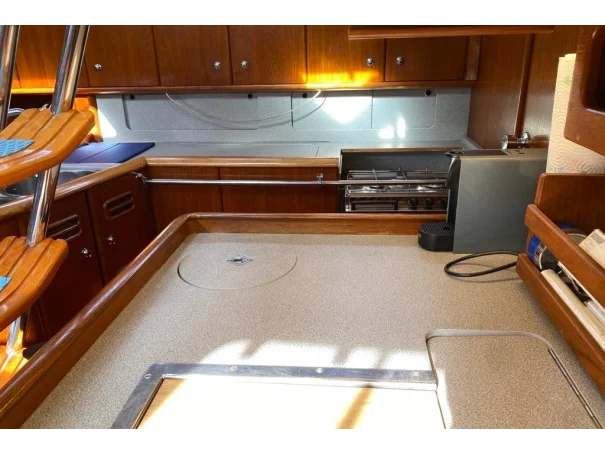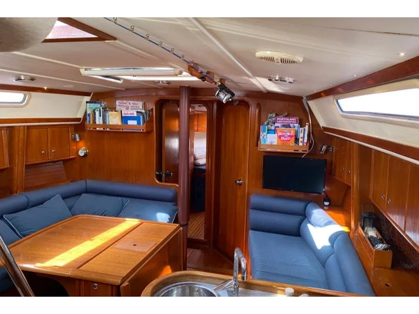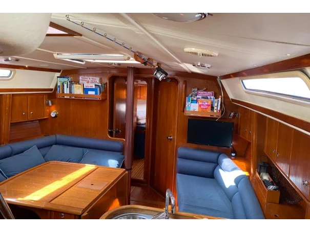 Saloon and Galley: The main saloon is arranged with a large C-shaped settee and dining table to port, complemented by two comfortable easy chairs to starboard. The adjacent galley is highly practical, running down the starboard passage to the aft cabin. It is well-equipped with generous counter space, deep sinks, and includes large, keel-cooled refrigeration/freezer units—a significant benefit for extended cruising.
