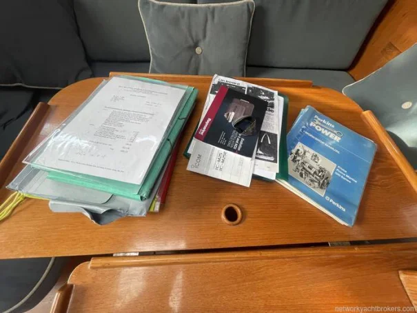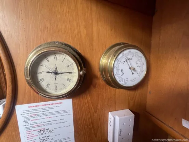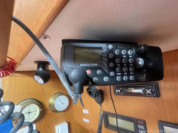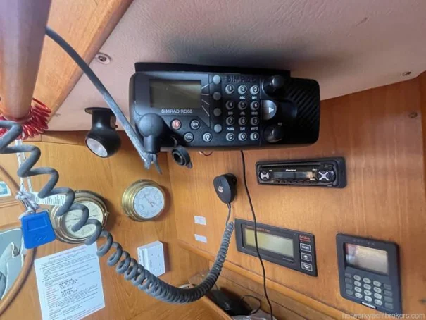 Starboard side nav station, with generous storage area : Ships Radio, 12v instrument panel, clock and barometer, Pioneer radio CD and speakers in cockpit and salon.