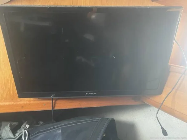 Port side aft cabin has a generous double berth with a sprung fitted mattress (2024) with generous underbed storage. There is also a washroom area encompassing shower head, shower tray and a sea head, with an over counter bathroom locker and a small clothes cupboard. 24" Samsung TV.