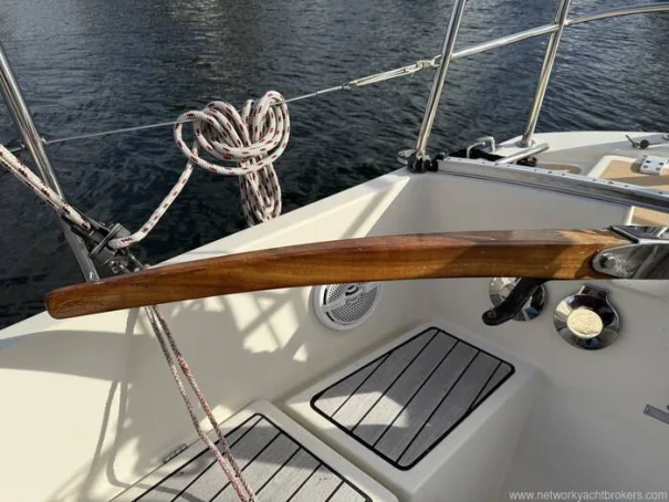 Gaff Cutter rig Wooden Spars with retractable bowsprit Stainless Steel standing rigging (inspected 2022) Running Rigging replaced 2023 Running back stays Twin line mainsail reefing Harken roller reefing Lazy jacks