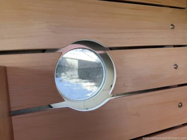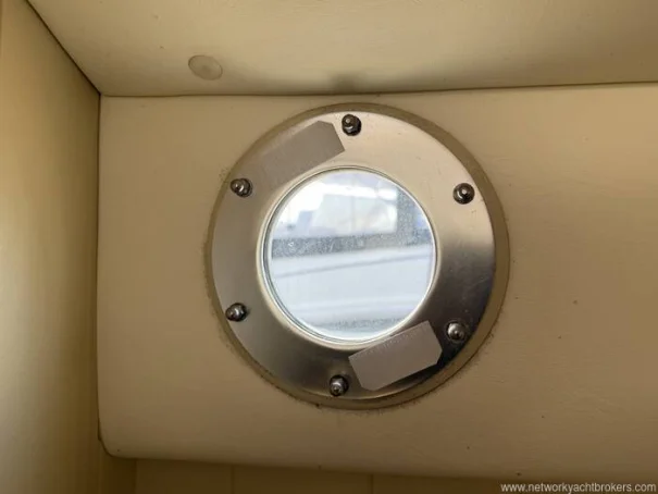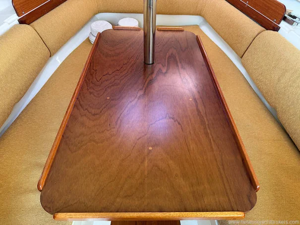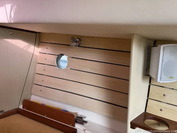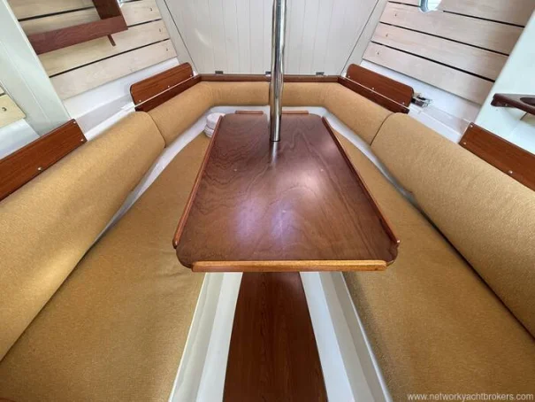 Full standing headroom Upholstery in Kintyre Antique Gold fabric Interior joinery in Teak Tongue & groove cream bulkheads and teak cappings