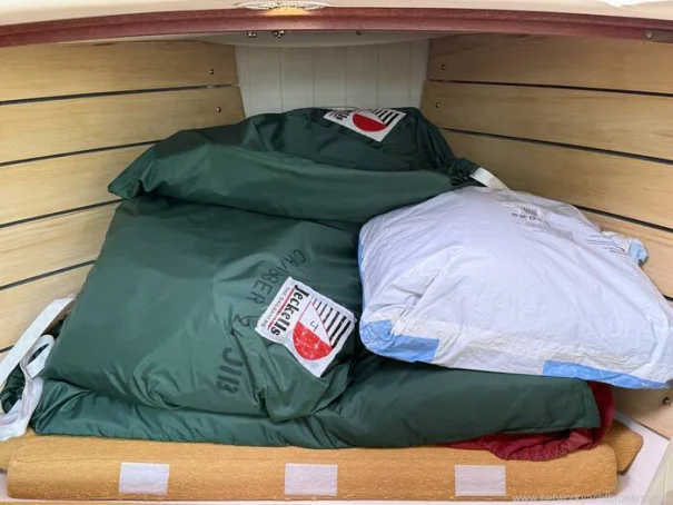 Mainsail - in tan Staysail with UV strip - in tan Jib with UV strip Topsail (never set) Sprayhood & Sail cover in maroon Cockpit winter cover (new 2024)