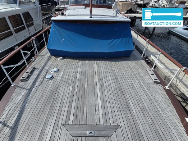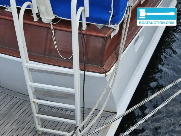 Known points of attention are the leaking teak deck, the railing that needs maintenance, and a defective float in the fuel tank. The leaking teak deck should be resolved by replacing the seams or completely replacing the deck to prevent further leaks (also into the bilge). Moisture has been present under the teak deck, which may have caused rust. The leakage currently causes optical irregularities, and as seen on the transom, there is clear wood damage. Rust is visible in the gangways. Fundamentally, it is a good ship with many recent modifications but a project to repair/replace the teak deck.Â
