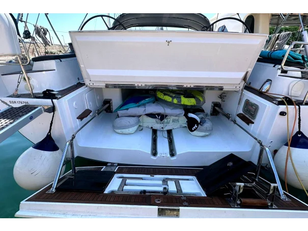 Está equipado con un completo paquete de seguridad, que incluye balsa salvavidas, boya luminosa Dan Buoy, aro salvavidas, ocho chalecos, manta ignífuga, extintores, bengalas y radiobaliza EPIRB Simrad.