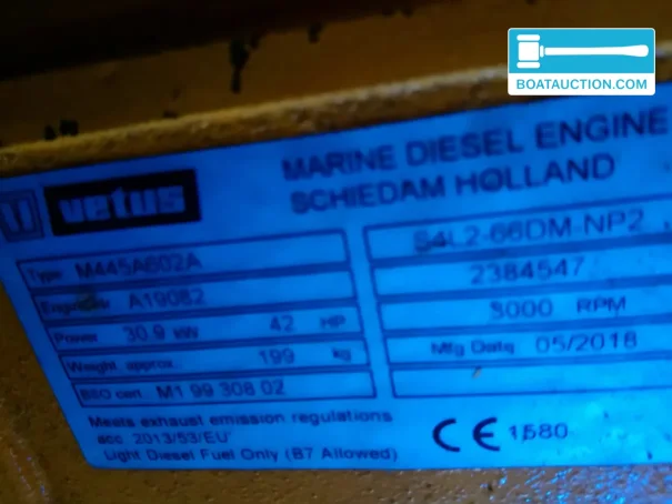 The Forna 37 is equipped with an inboard diesel engine from the brand Vetus, type M445A602A. This engine was built in 2018 and has a limited number of operating hours, with a maximum of 100 hours. The engine is electrically started and delivers a power of 42 hp. The gearbox is from the brand TwinDisc, type TMC 60P, with serial number 2384547. The boat has an electric bow thruster, which facilitates maneuvering in harbors and narrow waters.
