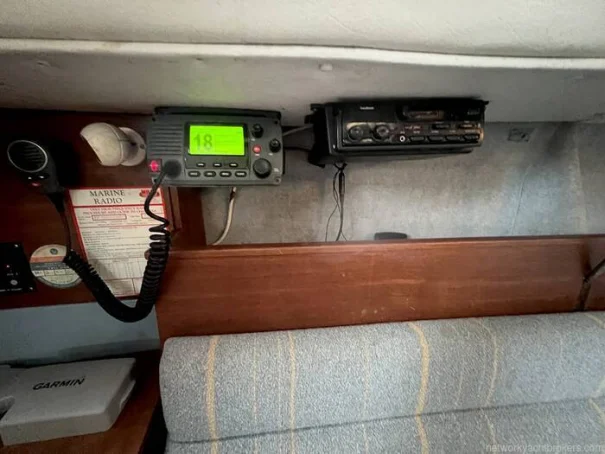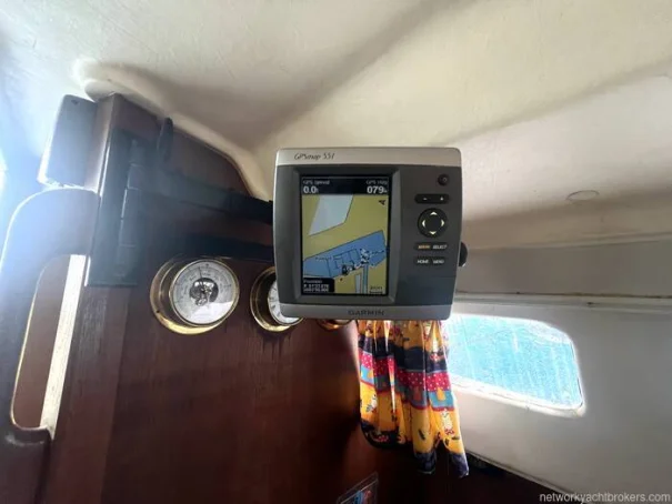 Compass Clipper depth sounder Clipper windspeed and direction West Marine VHF radio Garmin GPS Map 180 Windvane at masthead Navigation lights Steaming light.