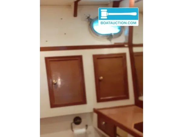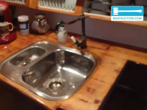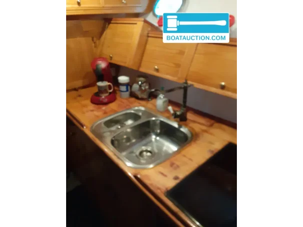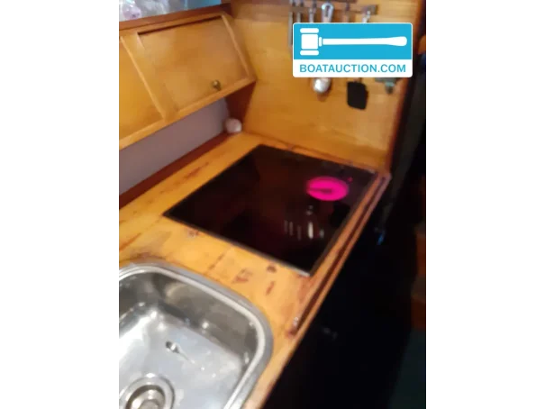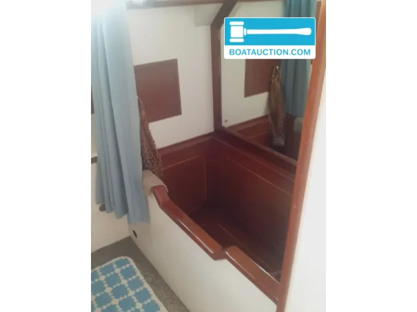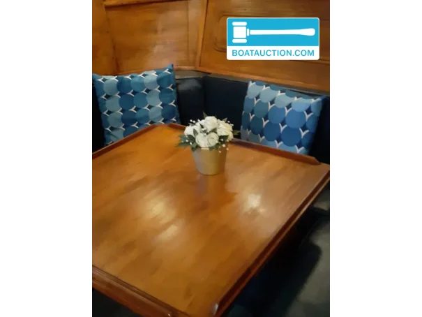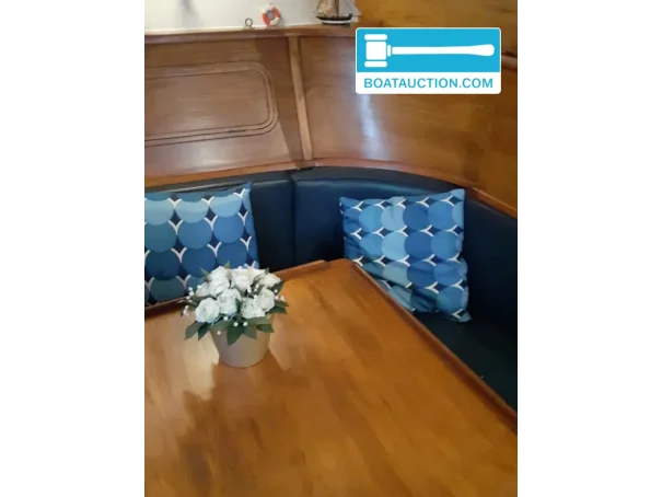 The salon has recently been varnished three times with a two-component varnish. The outer cover is functional but shows signs of use on the inside. Under the floor, there are hatches that provide access to the engine room. The salon also offers space for a chart table, TV and DVD connection, radio-CD player, and speaker system.