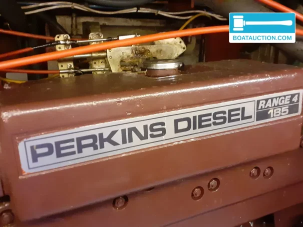 The ship is equipped with two Perkins inboard diesel engines, each with 186 hp, both from 1966. The engines are electrically started and operational. The fuel tank has a capacity of 700 liters, and there are additional diesel tanks under the rear sleeping area. The electrical installation includes a battery charger, alternator, inverter, shore power connection, solar panels, and six batteries. The onboard voltage is distributed over 12v, 24v, and 220v systems.