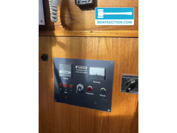 An electric bow thruster is present on board, making docking and maneuvering easier. The electrical installation consists of a battery charger, alternator, voltmeter, and shore power connection. There are two batteries on board with a total capacity of 280 Ah. The onboard voltage is 12V and 220V. A Farymann generator is present, but it currently does not start.