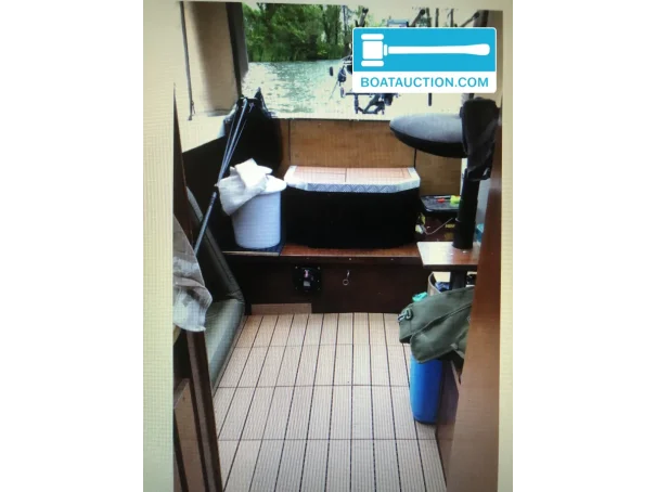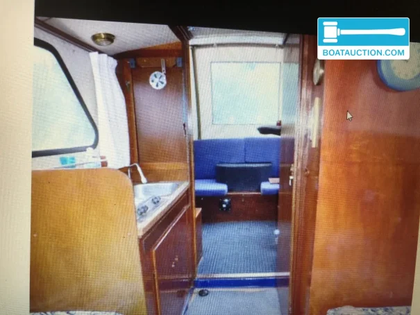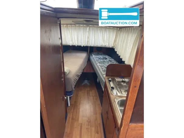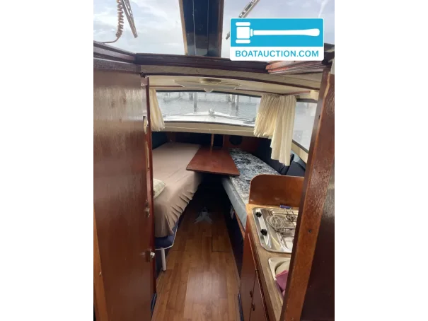 The Onedin 650 offers an interior standing height of 1.71 meters and has two fixed berths. The accommodation includes a dining area, a two-burner gas stove, a stainless steel sink, and kitchen cabinets. There is no toilet on board; the old through-hull fittings have been sealed, and the space is now used for storage. The boat is equipped with a water tank with a capacity of 100 liters.