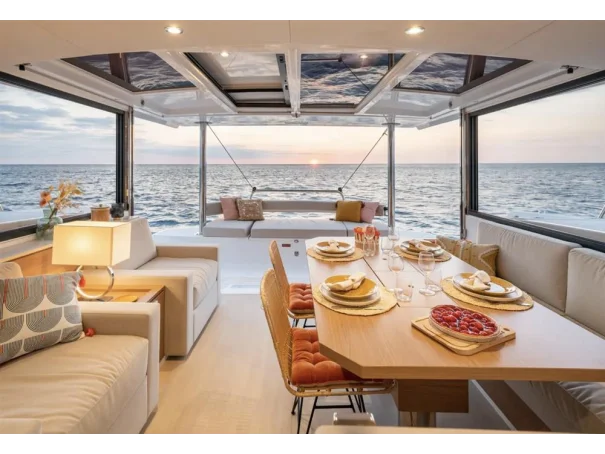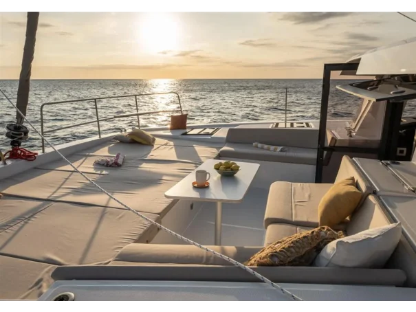 a forward cockpit with dining area and gigantic sunbathing area (20m²) in place of the traditional trampoline,