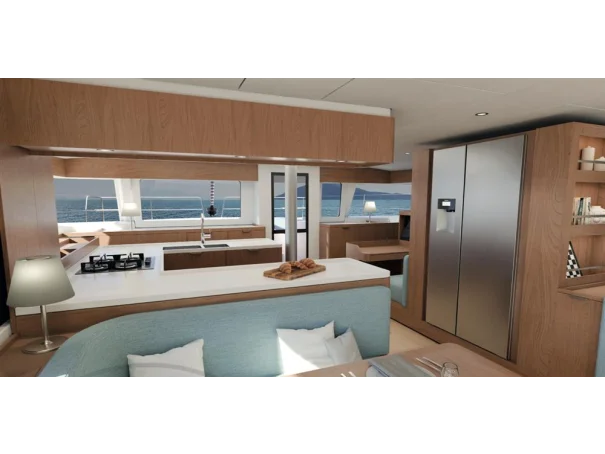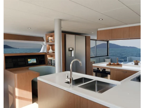 Its U-shaped galley, featuring ample overhead storage,