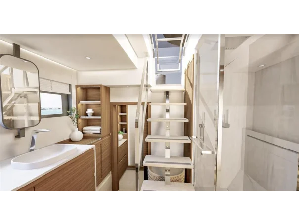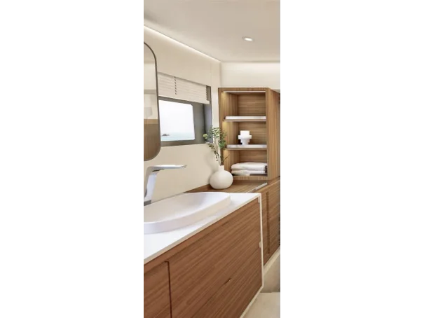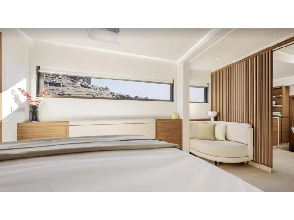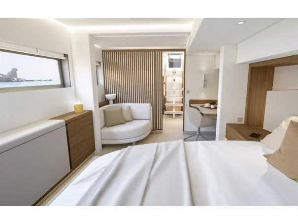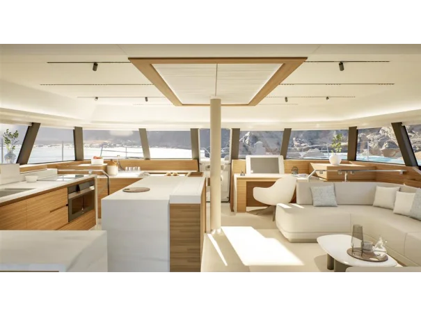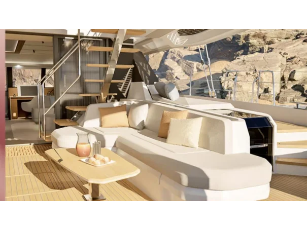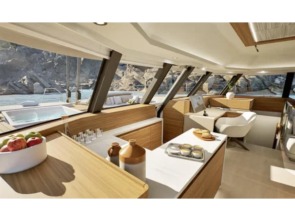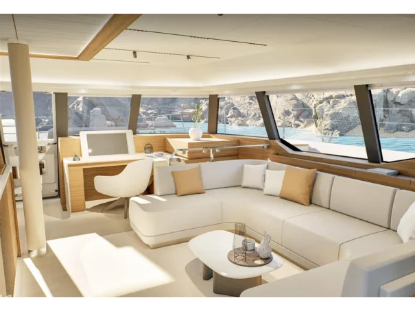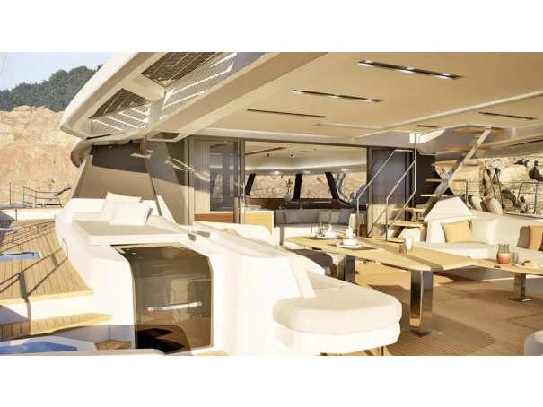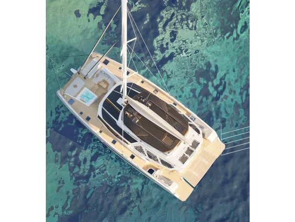 New 70s A catamaran yacht designed to match your rhythm. Up to 8 layout configurations. With the galley opening onto the aft terrace or positioned along the passageway, 3 to 6 guest staterooms, and up to 5 crew cabins, each arrangement is designed to enhance every moment on board and meet your lifestyle needs. A refined selection of materials, textures, and tones creates an atmosphere that reflects your personal vision. And beyond that, Fountaine Pajot is by your side to craft fully bespoke solutions. Available under crewed charter management Together with our partner, Euroyachts offers yacht charter management in worldwide destinations with a fleet of over 400 yachts. Our exclusive network partners of carefully selected and qualified charter operators for sailing yachts, catamarans or motor yachts from the major shipyards such as Lagoon, Bali, Jeanneau, Beneteau, or Evo Motoryachts can help you to get your dream yacht even financed. Exclusive new features include: Two side cockpits with opening wings, A Beach Club that’s 100% overlooking the sea to make the most of the anchorages, Storage spaces have been designed for all the toys, including forward lockers for paddleboards or scuba gear, and at the stern, a specific storage area for a water scooter under the large central bench seat. Elegance and FP DNA In true Fountaine Pajot style, you’ll find the line of the coachroof and the large windows giving an exceptional view of the sea, thanks to the glazed areas descending lower than the deck edge. The flybridge offers a magnificent area with dedicated relaxation, reception and navigation areas. The twin helm stations have been re-centred, with a winch for sailing manoeuvres positioned away from the relaxation areas. A real work area is thus reserved and protected for the crew.