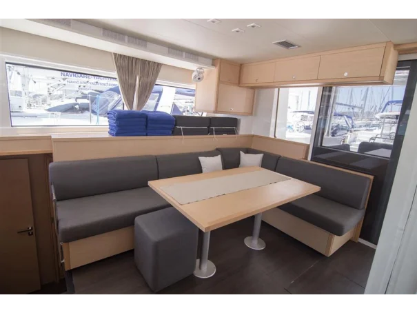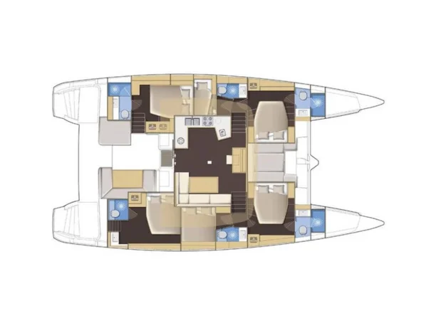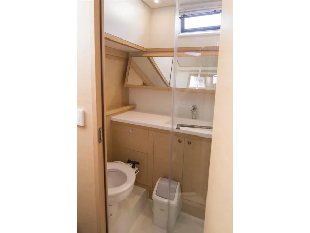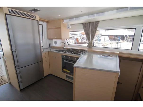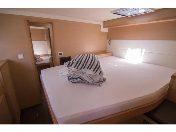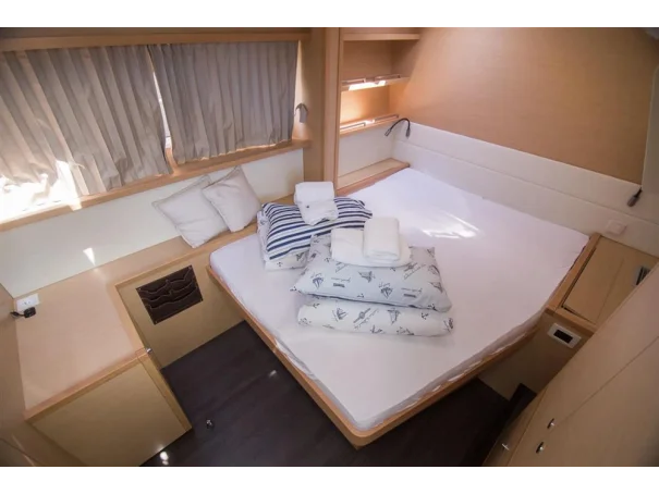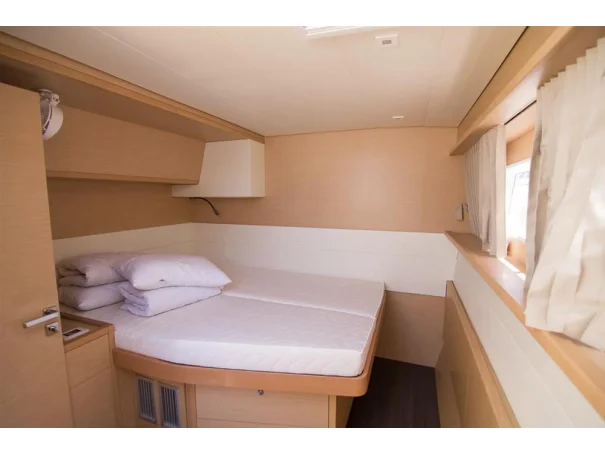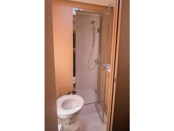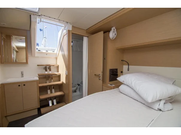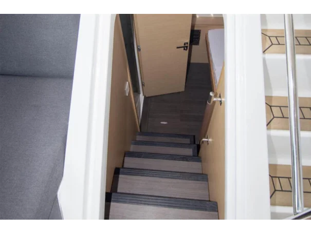 The saloon with dinette and lounge to starboard and a spacious pantry to port offer an exceptional living experience. The cabins are equipped with spacious double beds and optimally lit and ventilated by large hull windows.