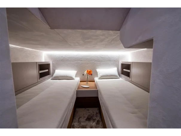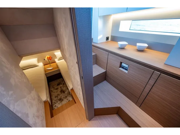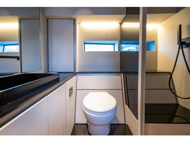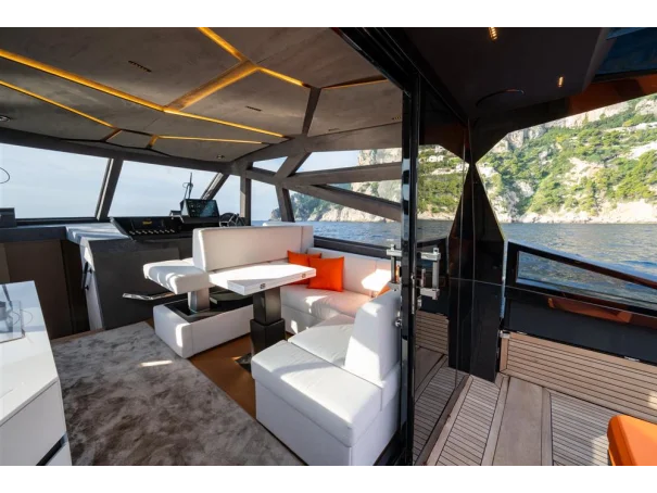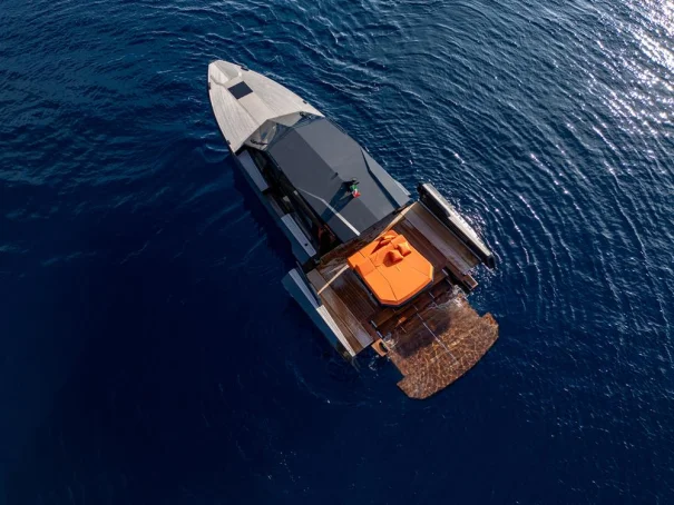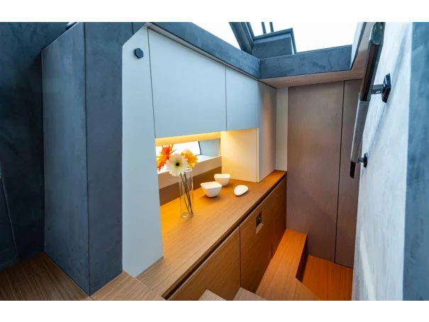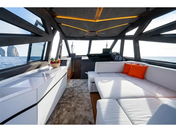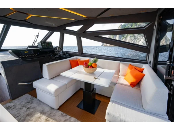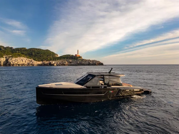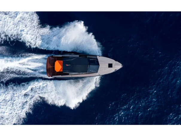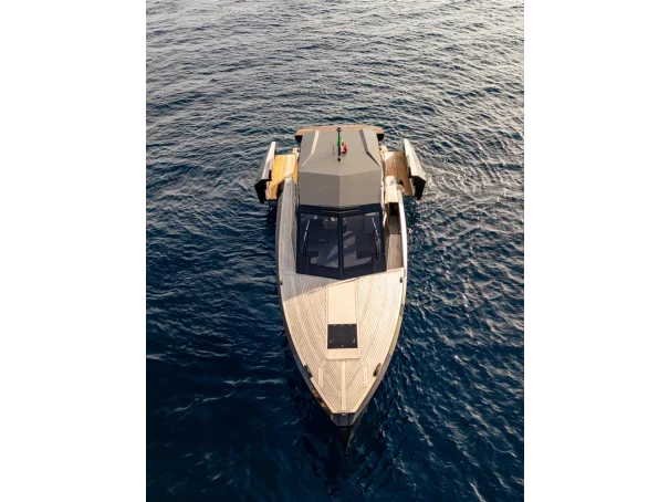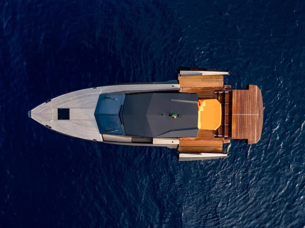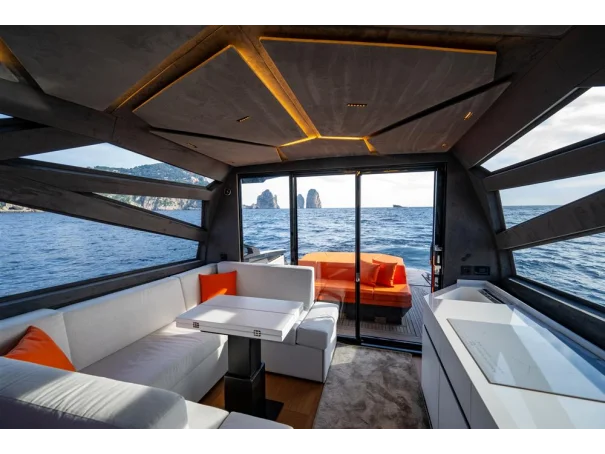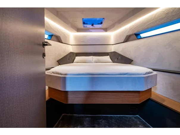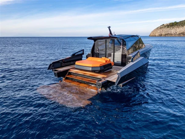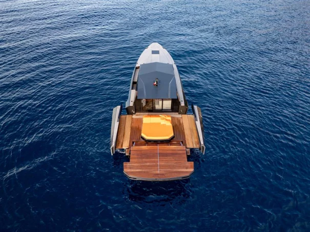 The Shipyard and Valerio Rivellini – who designed the exteriors and interiors – worked together to launch a model on the market that combines extremely liveable exteriors with the comfort of a cabin cruiser. The result is a 13-metre boat with striking styling that also offers exceptional comfort and lets owners enjoy cruises in all weather conditions, using the various areas in different ways, according to their needs, thanks to innovative, modular solutions for the hard top and stern area. Hard Top and glassed cockpit The aluminium hard top is produced in the shipyard and features several removable glas parts that allow this area to be partially opened, offering different living conditions according to requirements and the weather. As can be seen, this innovative solution offers the benefits of two different types of boat: with the hard top removed, the sensation is of an open yacht connected seamlessly to the surrounding environment, but always with the option of a quick and easy change of scene. Large beach area In the beach area, the totally custom multifunctional stern platform adds an extra metre in length to the boat when open, as well as offering a range of different ways to take full advantage of the yacht. This tender lift transformer is the result of collaboration between the Blu Emme shipyard, designer Valerio Rivellini and Besenzoni. The system’s excellent mechanical characteristics and movement mechanisms allow the swim platform to be lowered to about 80 centimetres below the sea’s surface, making it easier to enter or leave the water at any point of the stern, or to be extended completely for safe, convenient access even from high piers. The platform is wide enough to be used as a boarding ladder even with a tender or jet ski moored to it, without having to remove them. The sun sofa island featured in the centre of the beach area is accompanied by a multifunctional sliding dining table. Premium interior The premium interiors below deck are functional and can be personalised, offering comfortable settings where the focus is once again on transformability. A door opens onto the finely designed Plexiglas staircase, with a lighting system and large non-slip steps, and leads to a double cabin. Forward of the bathroom is a generous dinette with a kitchen unit large enough to accommodate various appliances, a foldaway table that can be converted into another double bed, and a mirror with a built-in TV.