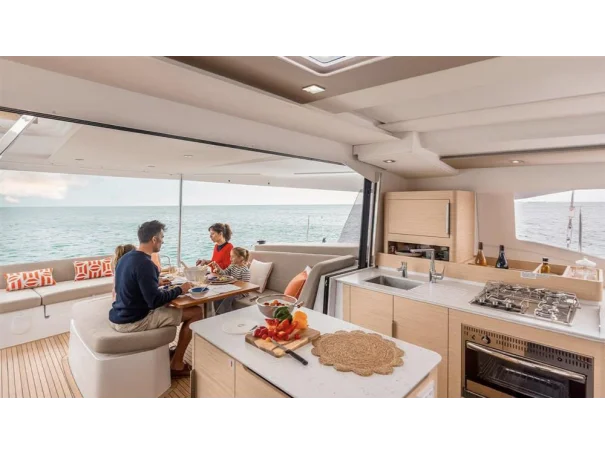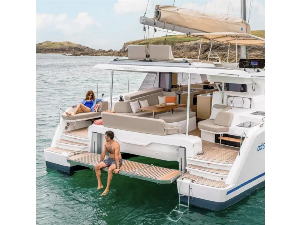 A true lesson in design: the horizontal lines of this compact 41-footer catamaran have been stretched to offer levels of harmony and elegance usually only seen on much larger models. This well-canvassed catamaran certainly knows how to lengthen her stride on long passages, while remaining fun and easy to handle close to the shore. The deck layout incorporates the double helm and manoeuvring station so popular on all the other models in the range: the skipper now has a pod housing all the instruments. As for the crew, they will find new areas for relaxation: sun loungers on the bimini and forward of the coachroof, not forgetting the ingenious lounger integrated into the port transom.