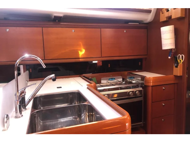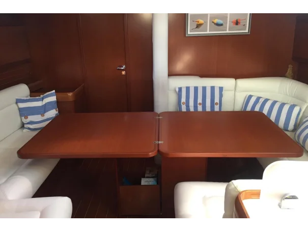 Three private cabins with twin heads make this layout ideal for family cruising or hosting friends. The saloon features a U-shaped dinette and separate chart table, while the galley is spacious and well-appointed for longer stays aboard.