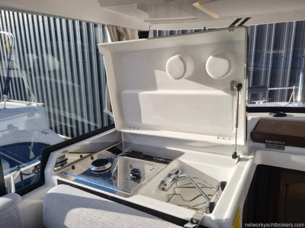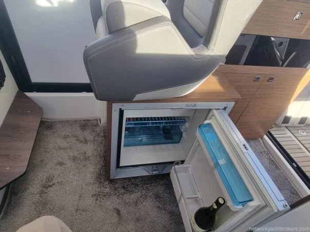 Key features of this new model include side door access from the helm station to the starboard side deck. There is a hull side access gate for safe boarding. The flush aft swim platforms are easily accessible. The sliding aft bench seat with a high back can move forward allowing for the engines to be raised. The saloon has a large opening sunroof allowing for lots of natural light. The galley offers lots of storage compartments, gas hob, sink and fridge, while the saloon table is convertible into another berth for guests. The bench seating at the saloon table can be adjusted to face forward while underway. Down below, the Merry Fisher 895 Sport has two double cabins and a separate shower and head compartment with holding tank. Curtains for wheelhouse and cabins. Luxe helm seat upgrade from standard helm seat. Sliding roof hatch and plenty of opening portlights and opening forward hatch.
