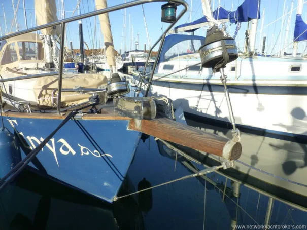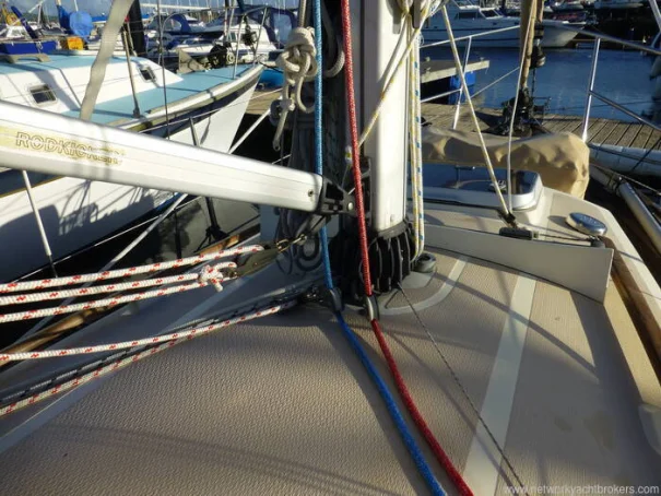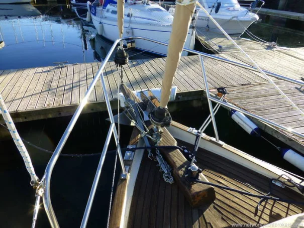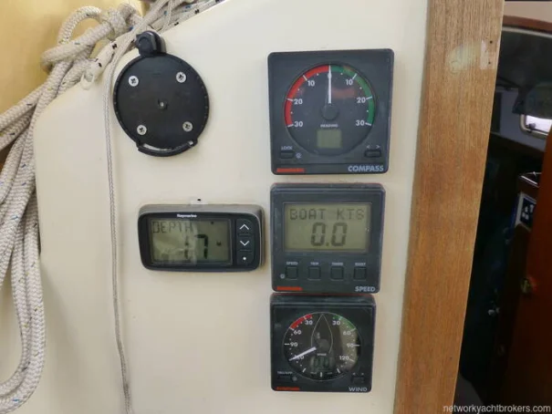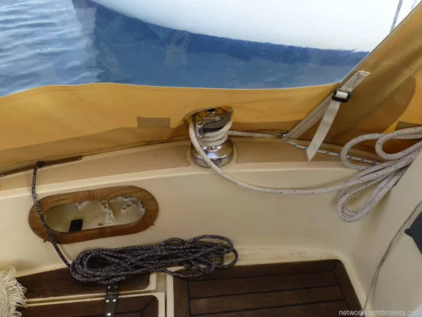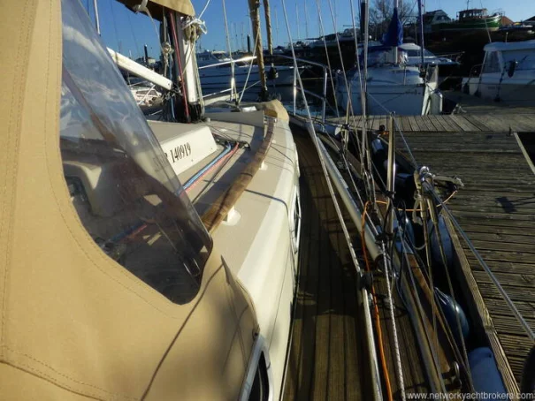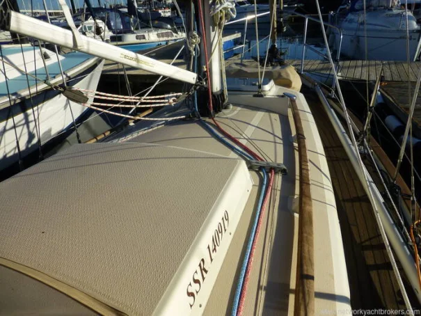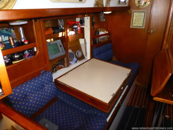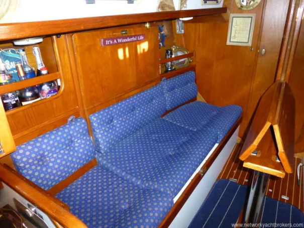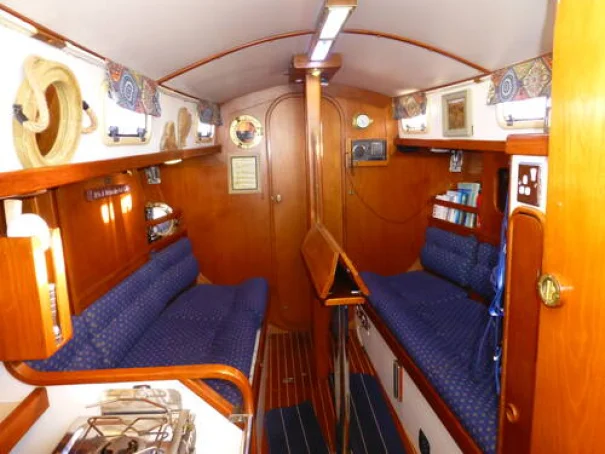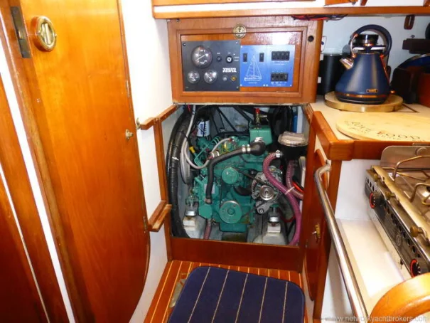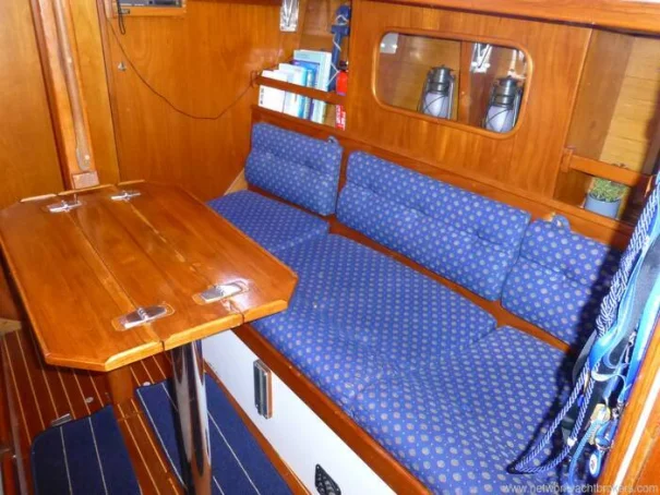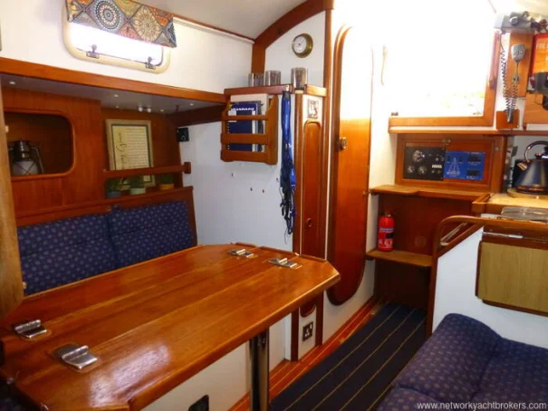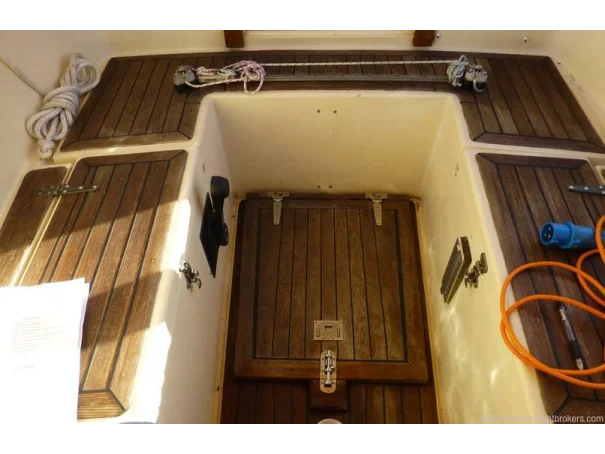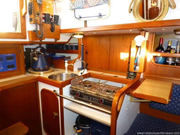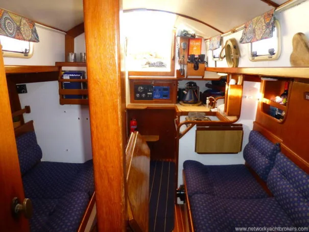 An L shaped galley at aft end to port and opposite to starboard, hanging locker and the heads compartment. The central companionway covers the engine compartment and leads to the cockpit above. Internally all in great condition, blinds throughout, blue upholstery teak and holly flooring.