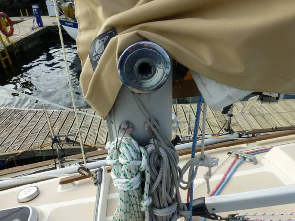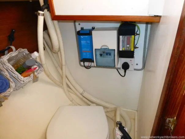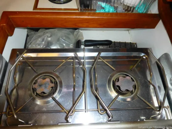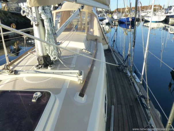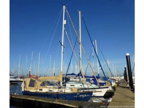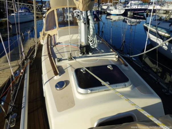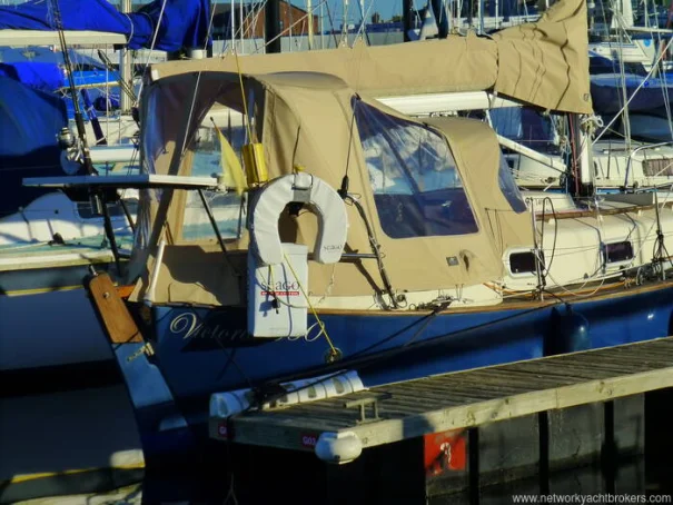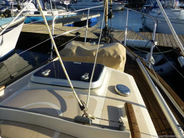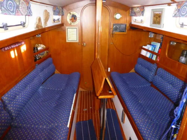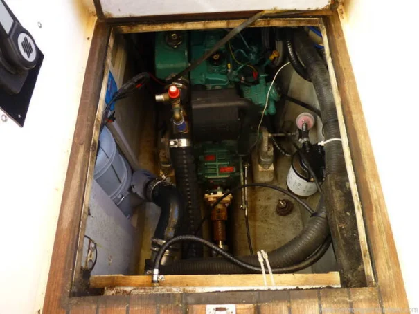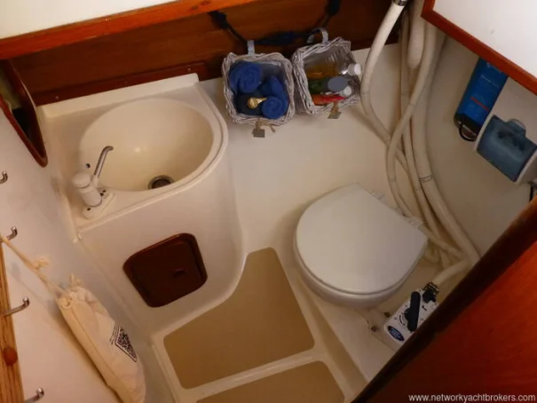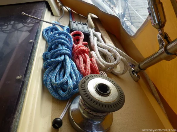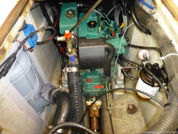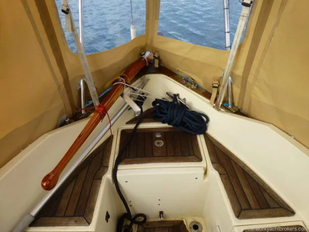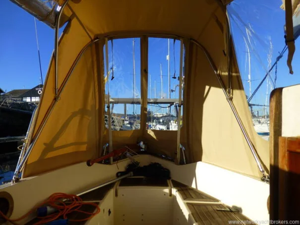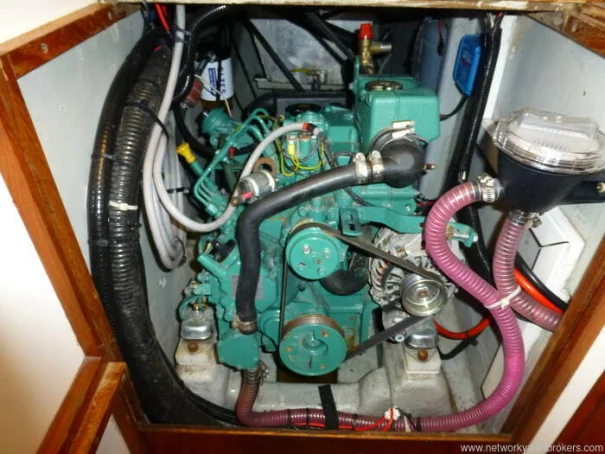 An L shaped galley at aft end to port and opposite to starboard, hanging locker and the heads compartment. The central companionway covers the engine compartment and leads to the cockpit above. Internally all in great condition, blinds throughout, blue upholstery teak and holly flooring.