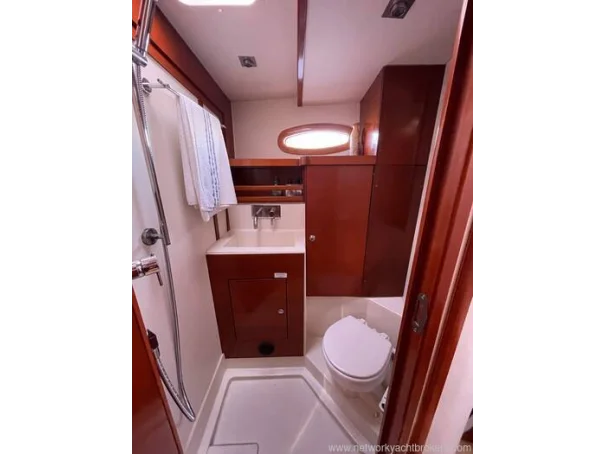 En-suite in the aft cabin with marine toilet, wash hand basin, shower and holding tank