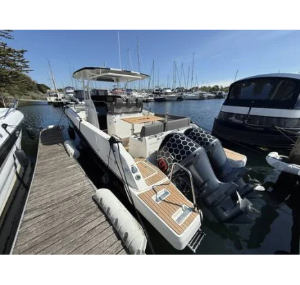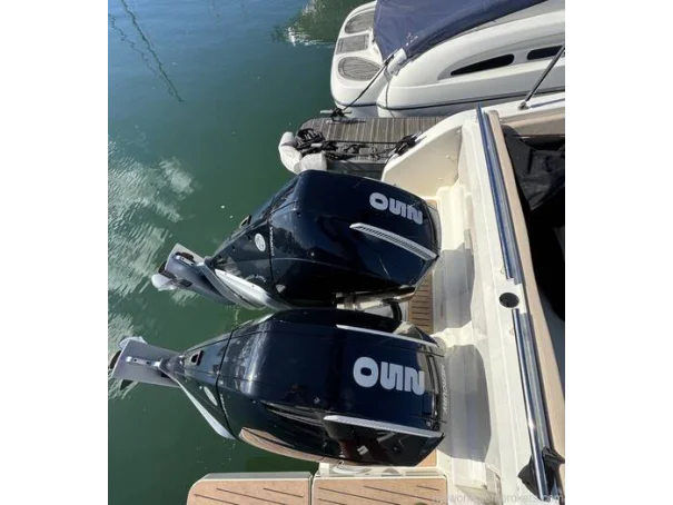 A 2022 Quicksilver 875 Sundeck powered by twin Mercury 250HP outboard petrol engines, offering strong performance with the capability for speeds over 50mph. This is a one-owner example from new.