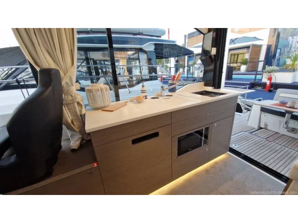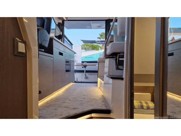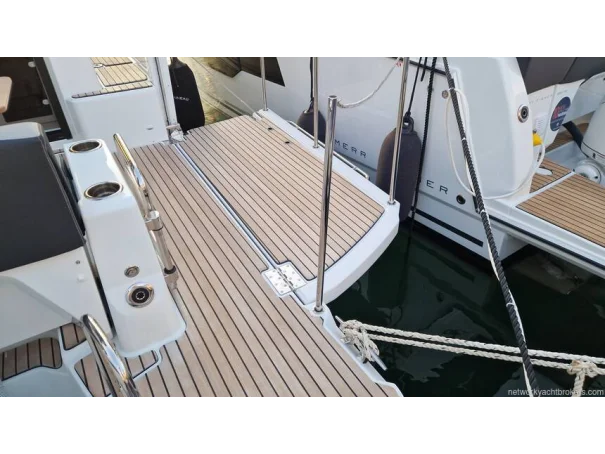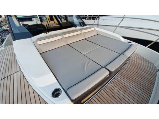 Synthetic teak - on cockpit fwd and aft, swim platform and side decks Cockpit shower - (hot & cold water) LED lights - in cockpit floor 2 rear cockpit worklights 1 rod holder U-shaped cockpit saloon + table + aft sunpad cushion pack: - (extra bench box behind sliding door + grp table + sundeck cushion) Ladder for cockpit deck locker Storage rack on roof - for stand up paddle Front cockpit upholstery pack:Lounge chairs and bow cushion for forward cockpit Deck search light Portside boarding door Movable backrest - for portside access Under-seat storage compartments