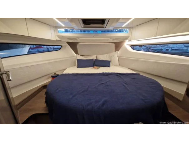 Opening porthole in cabin Opening deck hatch Hull windows Deck windows Ambiance LED lights LED lights Extendable double berth Headband cushion on the bed Premium mattress Removable carpet set Overhead lockers Hanging locker Large storage under the bed Backlit headboard 220V socket + USB starboard Spot-type reading lights Private access to the head