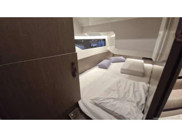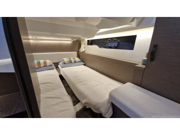 Opening porthole Lighting spot LED lighting 2 single beds Double berth complement Premium mattress Under-bed storage Headboard Seat at the cabin entrance Removable carpet set Hanging locker Bedside table 220V socket + USB starboard Storage niches